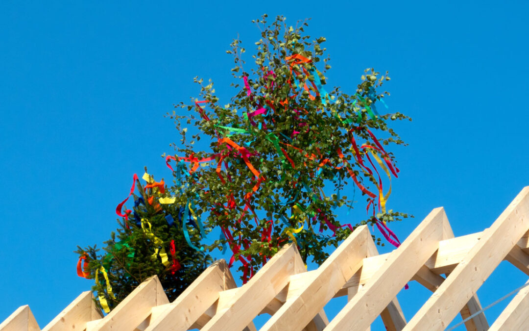 Originally, a tree was placed on the roof of a new building to appease the ancestors’ tree spirits. According to Scandinavian mythology, the wood contained a spirit, and a man’s soul could return to the tree after his death. Thereafter the practice spread to England with the Scandinavian migrations and gradually conquered Europe. The tradition is still alive in Germany as well as in Great Britain and the US, where it is known as the topping out ceremony. The celebration remains a way of protecting the building and thanking the builders.